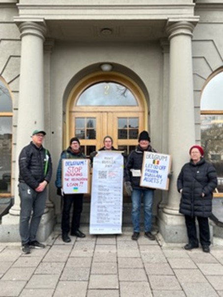 Manifestations internationales devant les représentations diplomatiques belges pour exiger que les avoirs russes gelés soient mis à la disposition de la défense du peuple ukrainien