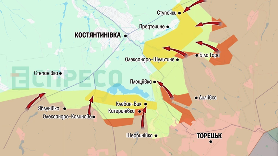 En octobre, Kostyantynivka est devenue l’une des zones les plus actives du front. Les Russes se rapprochent progressivement de la ville. La pression la plus forte vient de l’est. Les combats se déroulent pour les villages de Stupochky, Predtechyne et Oleksandro-Shultyne. La zone grise s’est tellement rapprochée de Kostyantynivka qu’un groupe de Russes a été repéré et éliminé dans ses rues la veille. Au sud, l’ennemi a presque entièrement pris Toretsk et s’approche de Pleshchiyivka, où les combats font actuellement rage. Parallèlement, les occupants progressent de Katerynivka vers Kleban Byk, et les forces armées ukrainiennes occupent progressivement des positions défensives au nord du réservoir de Kleban-Bytskyi.