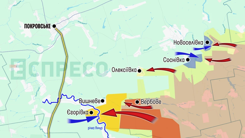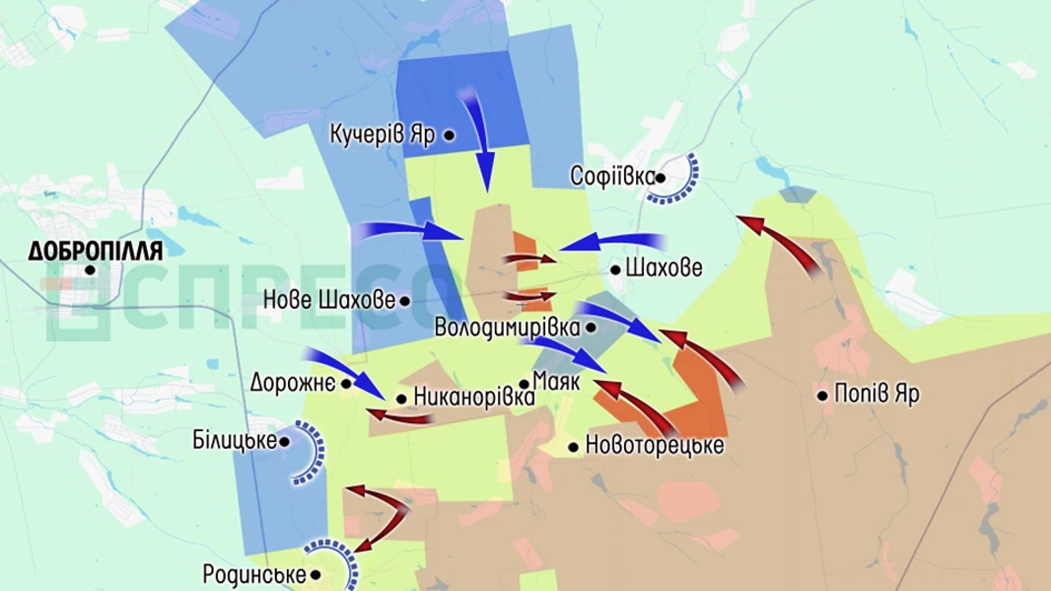 La section du front entre Pokrovské et Dobropillé reste la plus critique : c’est là que les Poutines progressent quotidiennement à travers les territoires de Zaporijjia et de la région du Dniepr. En une semaine, ils ont réussi à étendre la zone de contrôle de Verbovyé au sud jusqu’aux rives du fleuve Yanchur, qu’ils ont tenté de franchir près du village de Yehorivka. Au même moment, l’ennemi a attaqué Vychneve, mais n’a pas été autorisé à y prendre pied. Néanmoins, les occupants progressent jusqu’à la route Pokrovské-Gouliaïpole. Pour la couper, il leur reste encore environ 10 km à parcourir. S’ils parviennent à prendre pied à Yehorivka, ce ne sera que 6 km. Actuellement, cette section du front constitue la plus grande avancée des occupants dans la région du Dniepr, mais leur pénétration à l’arrière de notre ligne de défense près de Gouliaïpole représente une menace bien plus grande.