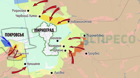 Cette semaine, les Poutines ont lancé une offensive massive sur Pokrovsk et Myrnograd afin de s’implanter dans ces villes. L’ennemi a attaqué Myrnograd de trois côtés : au nord, depuis l’estuaire de la rivière Rouge, à l’est, depuis Novoekonomichesky, et au sud, en tentant une percée de Grodovka à Kozatsky et Promyen. Au nord et à l’est, les forces de défense ont repoussé les attaques et repoussé les Russes vers leurs positions initiales. Les groupes qui avaient réussi à pénétrer dans la ville ont été détruits. L’ennemi a néanmoins réussi à progresser de quelques kilomètres et à prendre pied près de Promyen, avec la perspective de poursuivre l’offensive.