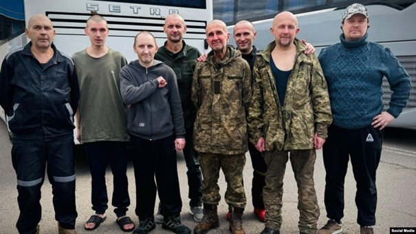 Vladimir Mykolaenko (quatrième à partir de la droite) et d'autres libérés de la captivité russe le 24 août 2025.