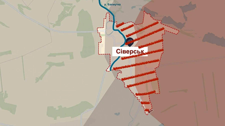 Selon le scénario le plus optimiste, au 13 décembre, la ligne de front des combats à Siversk longe la rivière Bakhmutka. Ainsi, la partie est de la ville, plus étendue, est entièrement sous contrôle russe, tandis que la partie ouest, plus petite, conserve des positions ukrainiennes par endroits.