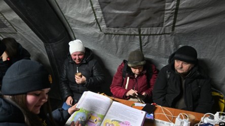Des habitants de Kyiv se rassemblent dans l'un des points spécialement aménagés pour se réchauffer, recharger leurs téléphones et boire du thé.