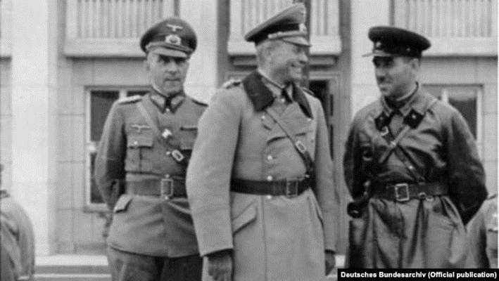 Défilé conjoint de la Wehrmacht et de l’Armée rouge à Brest le 22 septembre 1939, après la défaite de la Pologne. le général allemand Heinz Guderian (au centre) et le brigadier soviétique Semen Krivoshein (d’origine juive) communiquent amicalement