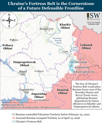 La réalité sur le champ de bataille est que la Russie a peu de chances de s’emparer de la Ceinture de forteresses dans un avenir proche. Les lignes ukrainiennes tiennent bon et continueront probablement à tenir. La situation sur le champ de bataille est difficile mais pas critique pour l’Ukraine. Si les offensives russes restent dangereuses, un effondrement des défenses ukrainiennes est de plus en plus improbable. [3] Les meilleures perspectives des forces russes pour 2026 sont des gains marginaux continus. La Russie ne s’emparera pas du reste de l’oblast de Donetsk cette année. Dans le cadre d’hypothèses optimistes favorables à Moscou, les forces russes pourraient être en mesure de s’emparer de Donetsk fin 2027 ou début 2028, à condition que les partenaires internationaux de l’Ukraine continuent de soutenir ce pays. Mais même cette prévision, fondée sur des hypothèses favorables aux performances russes, n’est pas certaine.
