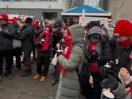 New York state nurses association, ce syndicat est à l’initiative de la grève en cours de 15 000 infirmières à New York. Les infirmières se soucient au-delà du chevet du patient. Plus tôt dans la journée, les infirmières de l’hôpital Mount Sinai se sont réunies sur le piquet de grève pour honorer Alex Pretti, Renee Good et les victimes tuées par l’ICE et être solidaires des immigrés et des familles.