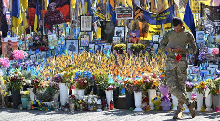 Des militaires ukrainiens sur la place de l’Indépendance à Kiev, le 5 septembre 2025.